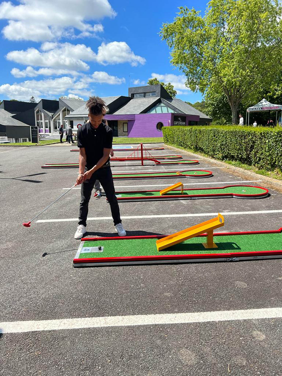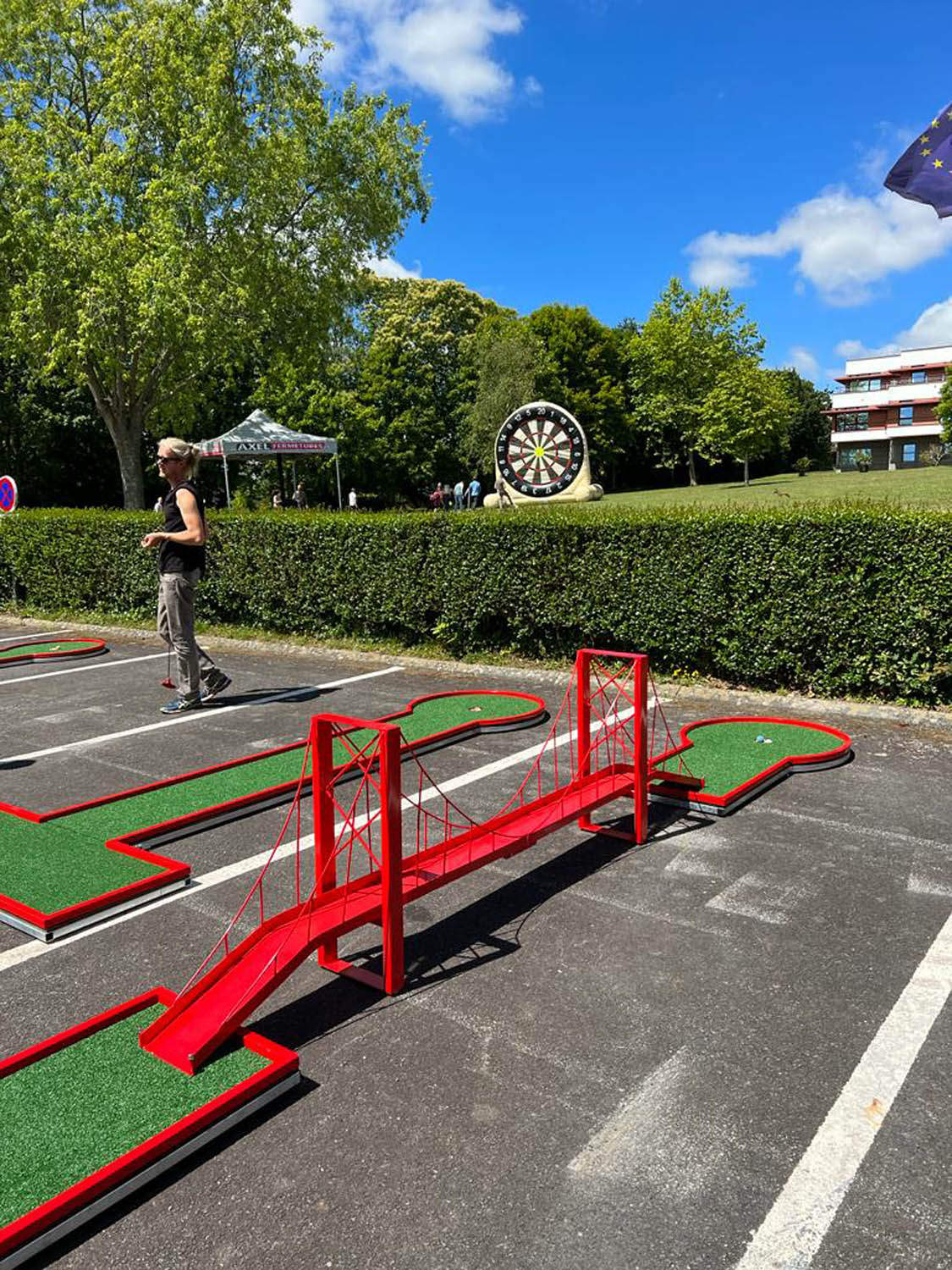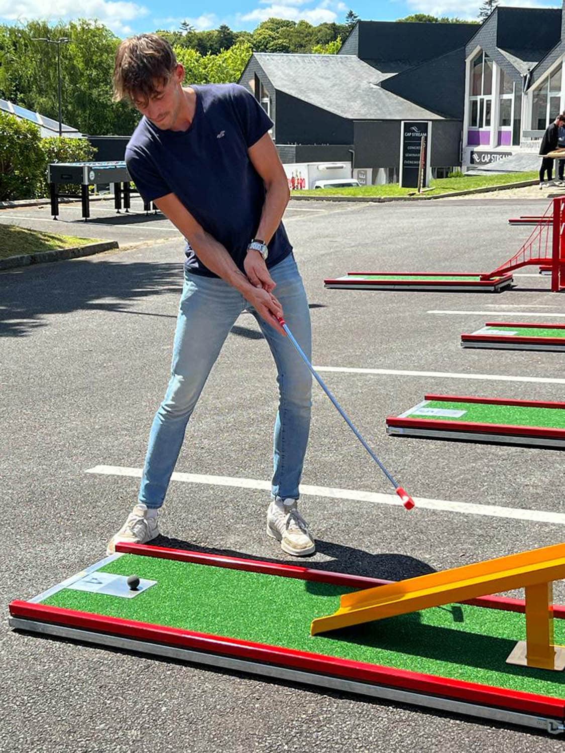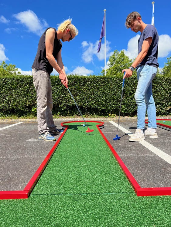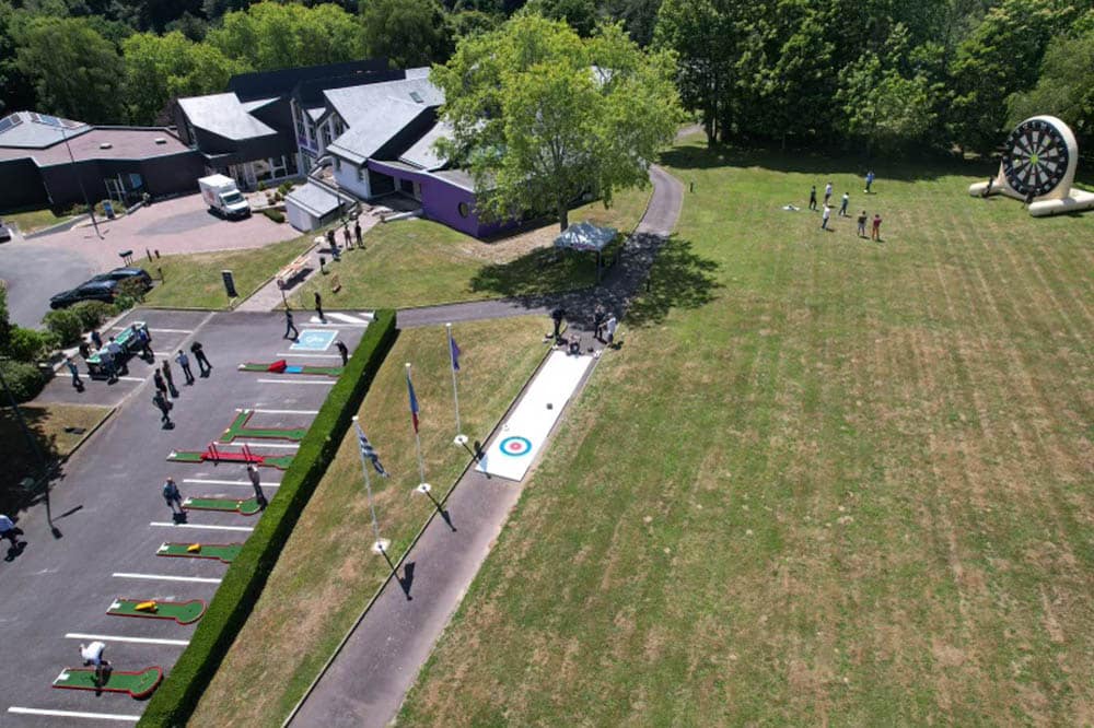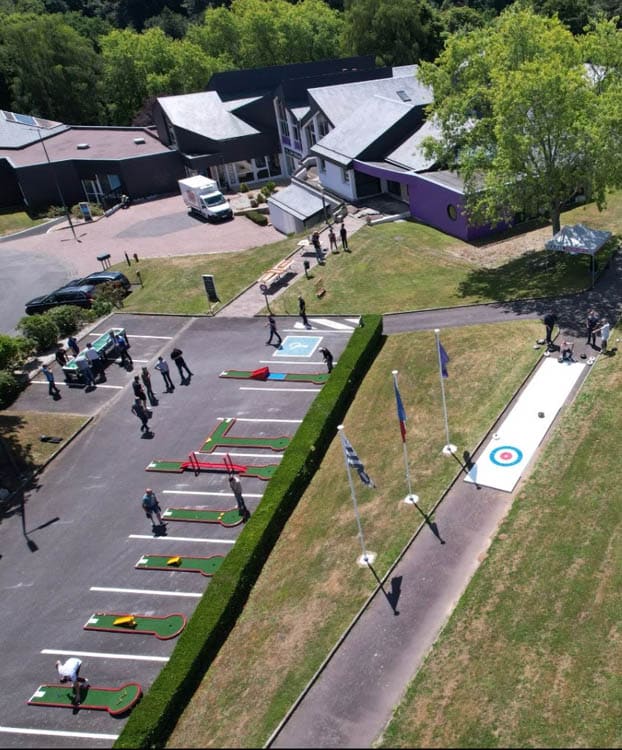 Découvrez les clés du geste parfait en vous munissant d’un putter ou autres drivers sur des pistes à difficultés variées, certaines comportant des ponts, des pentes, des virages à rebonds, tout cela dans l’objectif de créer des pièges et difficultés qui peuvent monter crescendo et contribuer à générer un challenge entre amis, collègues, clients, adolescents, adultes ou enfants. Testez la dextérité, la concentration et la gestion du stress des participants dans le cas où vous organisez des défis en équipe, ou sur des challenges en « contre la montre » pour atteindre les cibles le plus vite possible. Le pré requis physique? Il n’y en a aucun: notre volonté est de vous proposer une activité sans condition sportive spécifique ni connaissance préalable de cette activité, l’objectif poursuivi est l’amusement et le divertissement sans transpirer: idéal pour des team buildings, séminaires et autres activités en présence de vos clients.