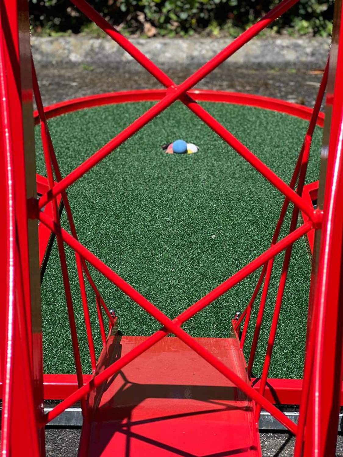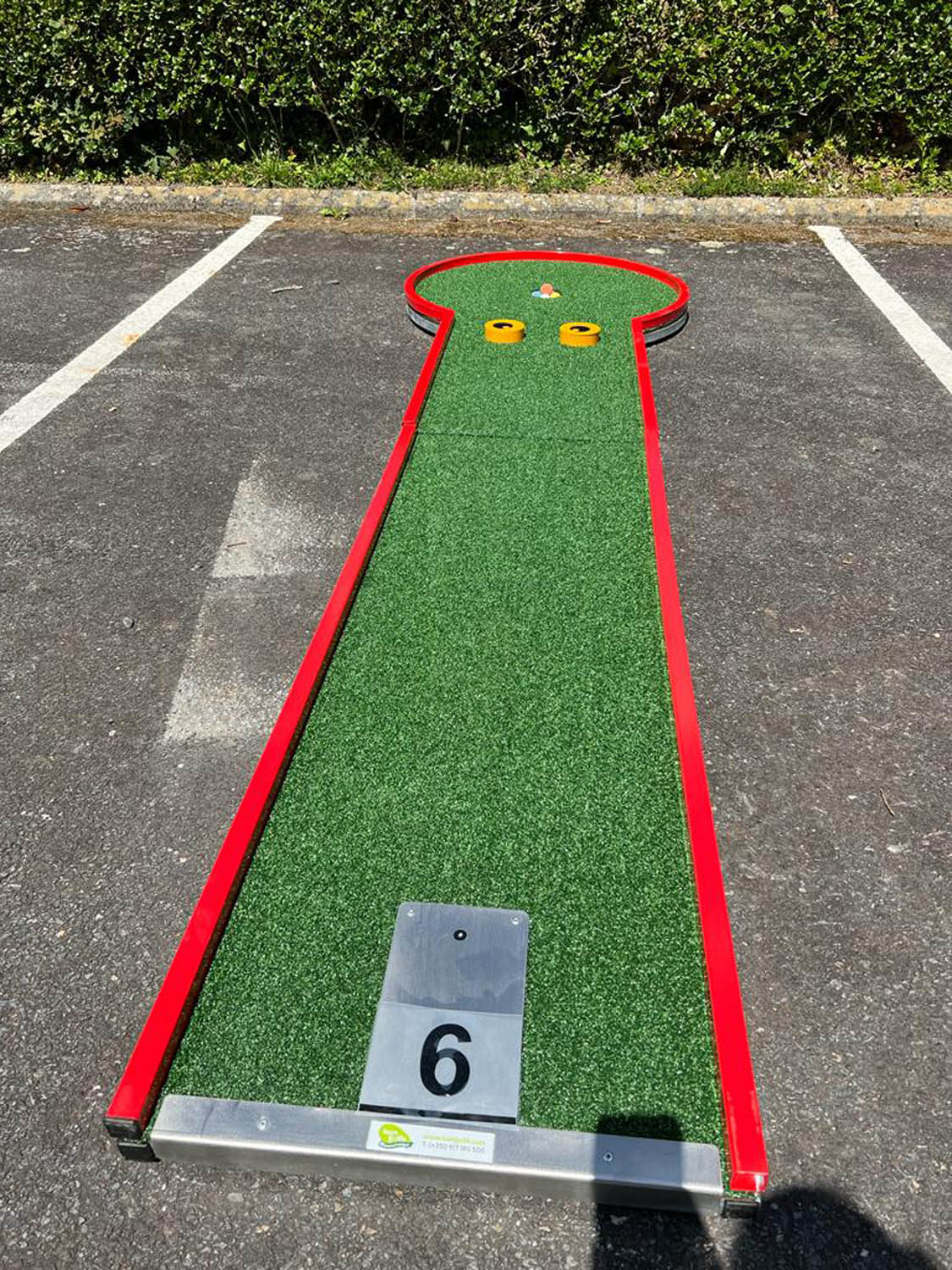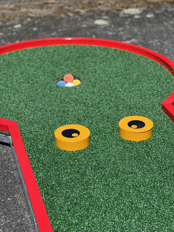 A savoir : pistes en aluminium avec revêtement en gazon synthétique. Moquette sous les pistes. 2 clubs par pistes et balles, ainsi que des fiches de jeu et panneaux explicatifs.