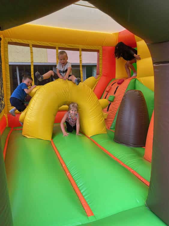 La structure est multi activités : sur le thème jungle les enfants gravissent les marches du toboggan adapté dès 3 ans, et atterrissent en toute sécurité sur le matelas gonflé surmonté d’une tête de perroquet, tapis équipé des modules au dessus desquels ils peuvent sauter. L’entrée et la sortie se font sur la même face de structure : ce qui est parfait pour localiser facilement son enfant, et au passage réaliser de jolies photos!