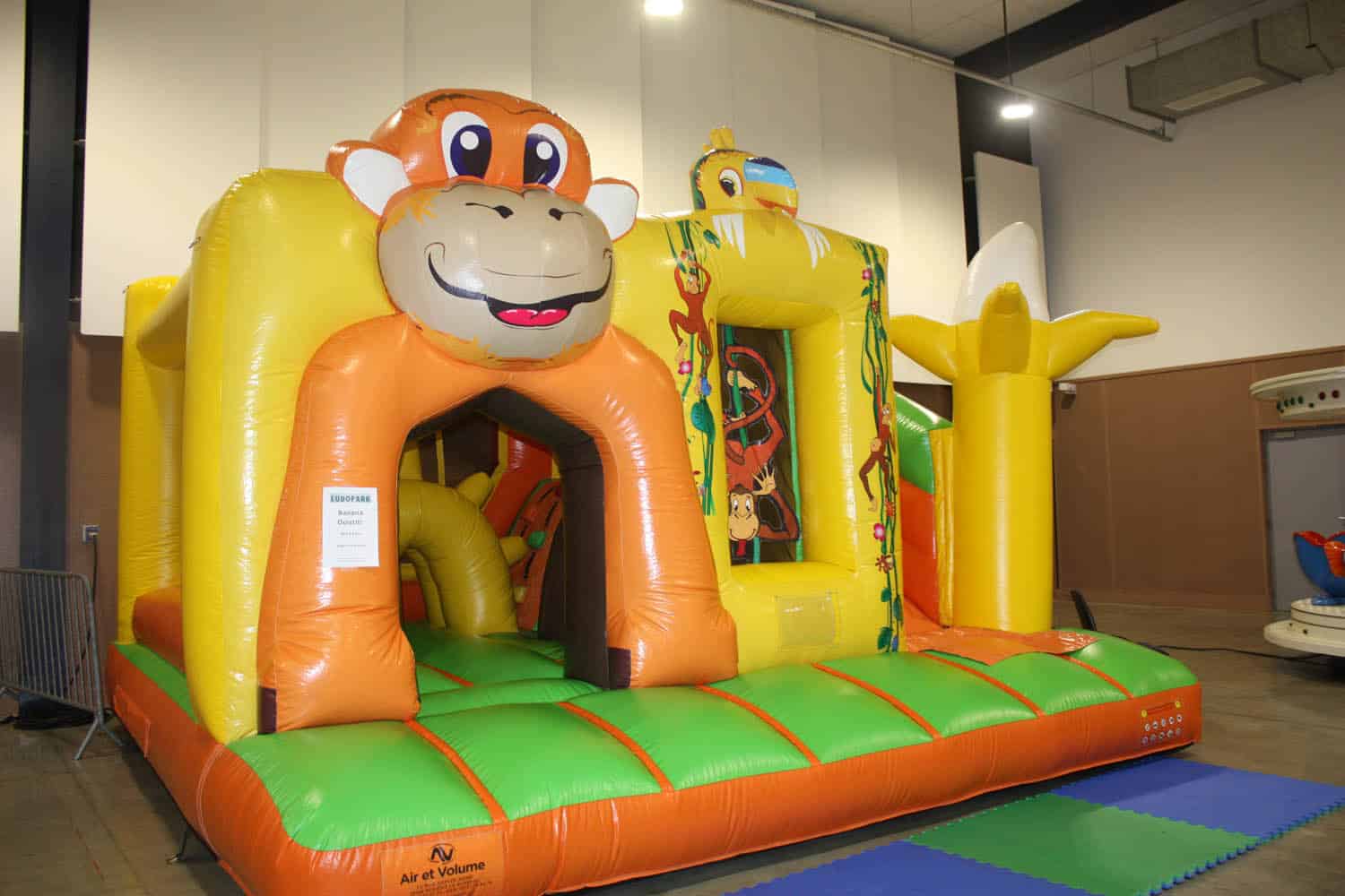 Une nouvelle structure sur le thème des animaux et de la jungle: découvrez le module gonflable « Banana Ouistiti ». Sur cette toute nouvelle structure en mode combi slide, les enfants entrent dans un escalier au niveau d’une banane géante directement en provenance de l’univers poétique de Tarzan, et descendent un toboggan pour arriver dans une aide de jeux aux multiples modules sous lesquels se faufiler, puis ressortir par le portique gonflé surmonté d’une tête de ouistiti.